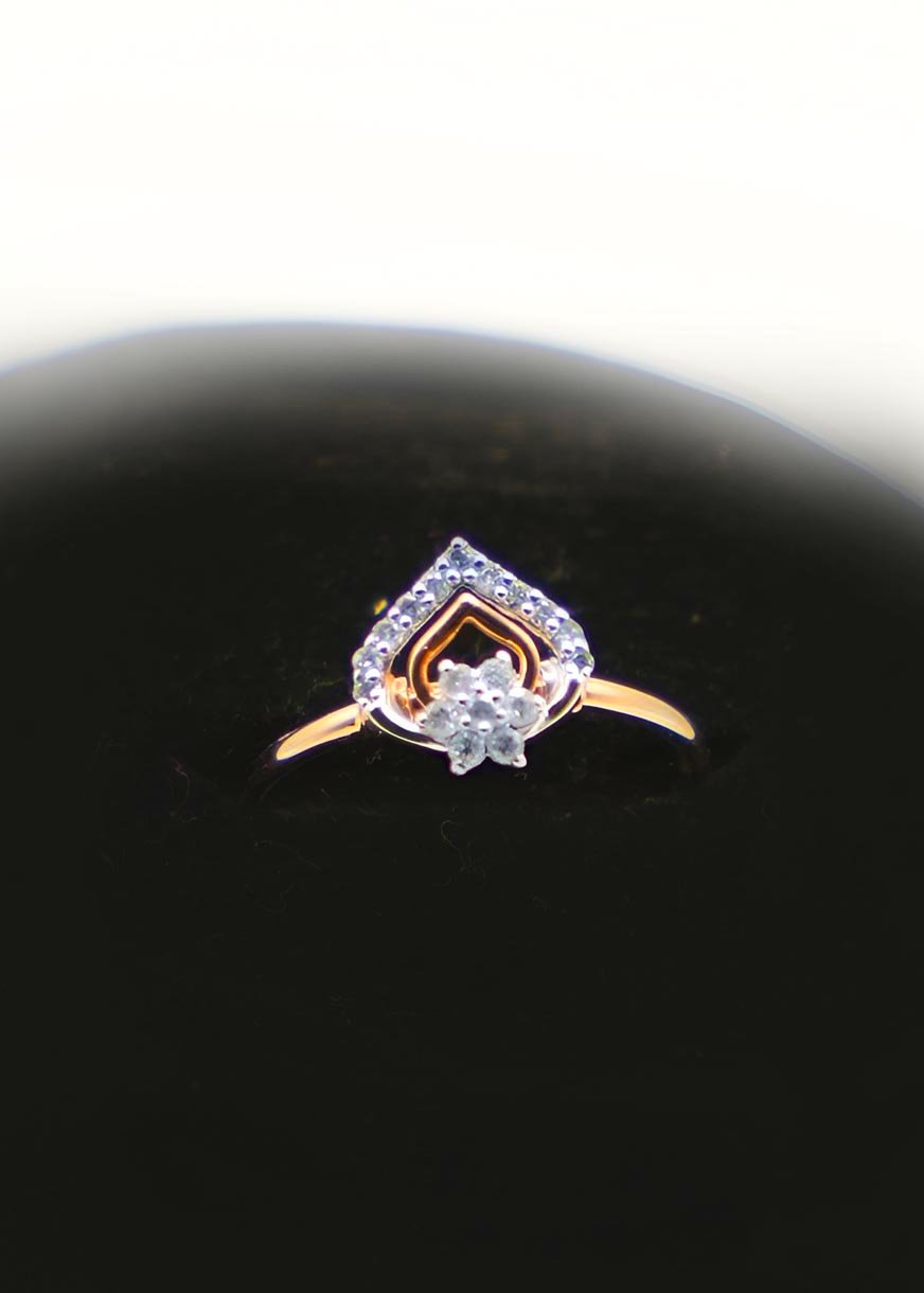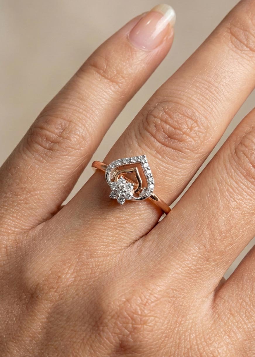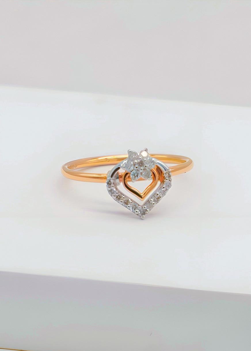 This beautifully designed ring is divided into two artistic sections — an outer heart-shaped frame symbolizing love, and a central floral motif that pays tribute to nature’s eternal elegance. With its shared prong setting, the diamonds deliver maximum brilliance while maintaining a sleek and graceful appearance.