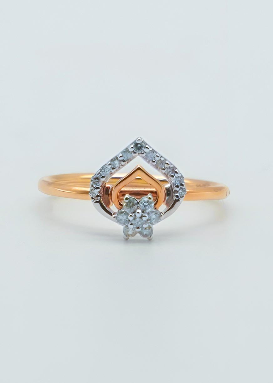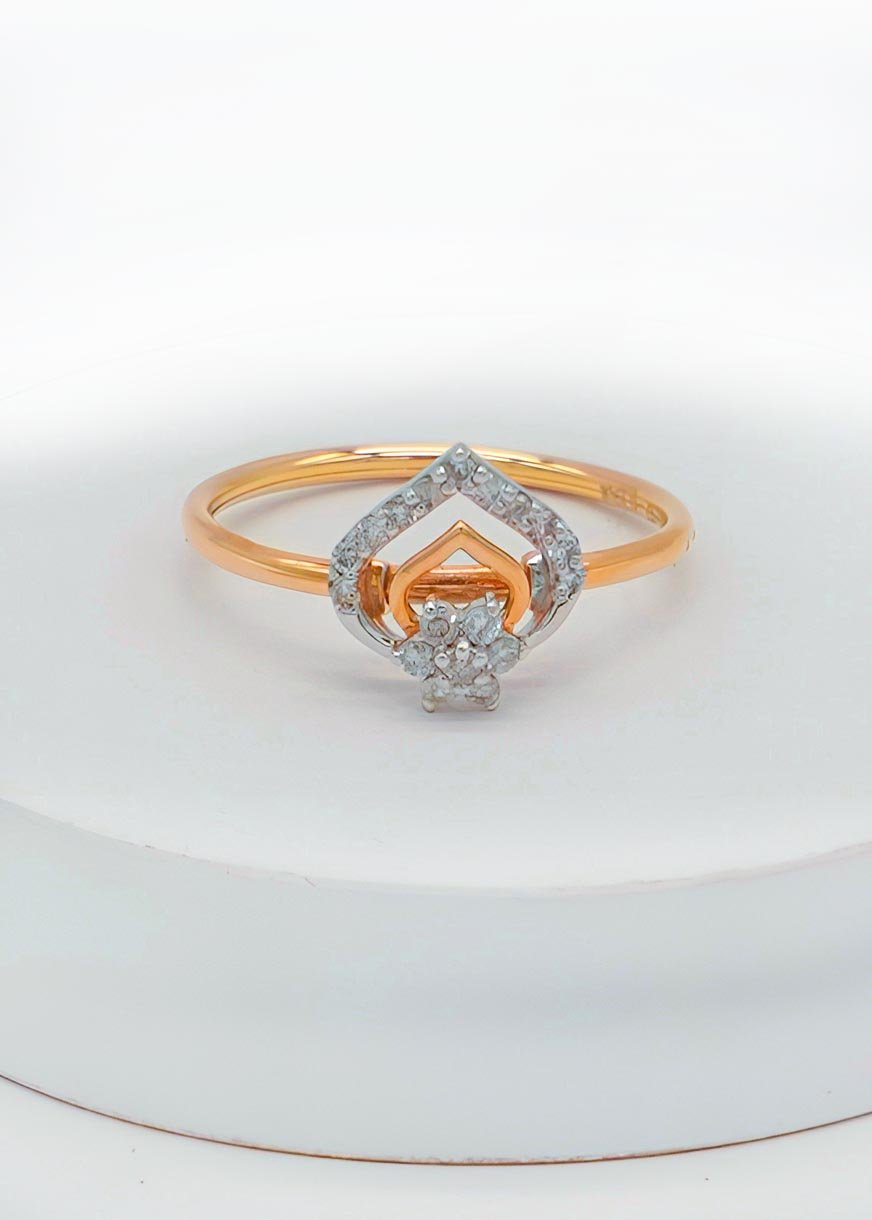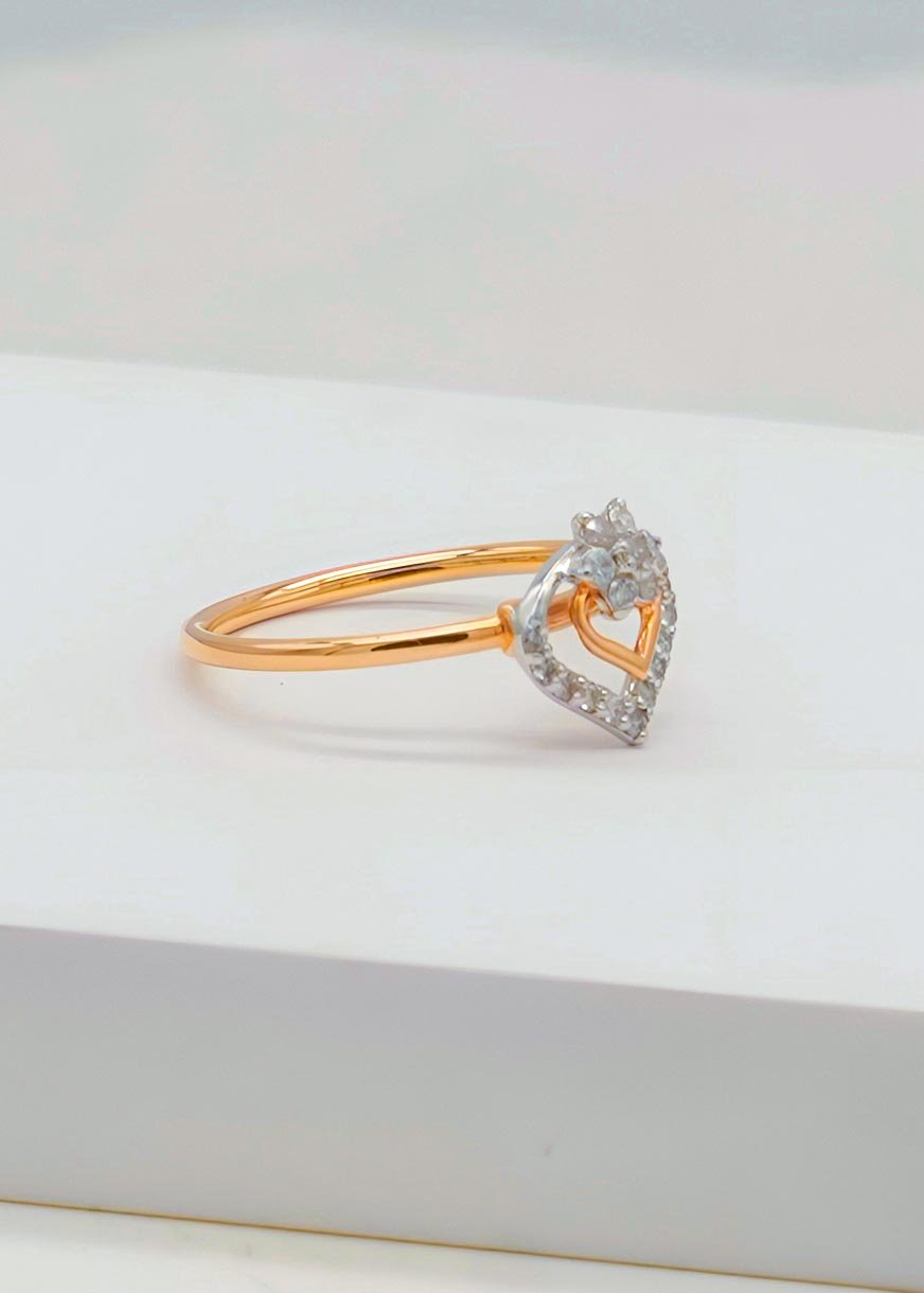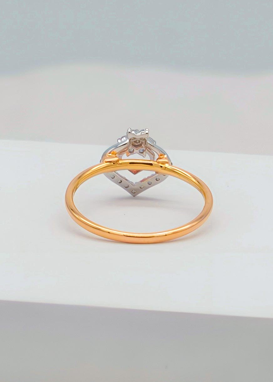 This beautifully designed ring is divided into two artistic sections — an outer heart-shaped frame symbolizing love, and a central floral motif that pays tribute to nature’s eternal elegance. With its shared prong setting, the diamonds deliver maximum brilliance while maintaining a sleek and graceful appearance.
