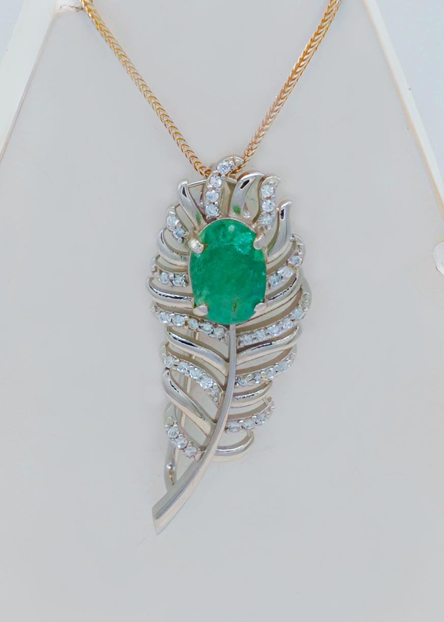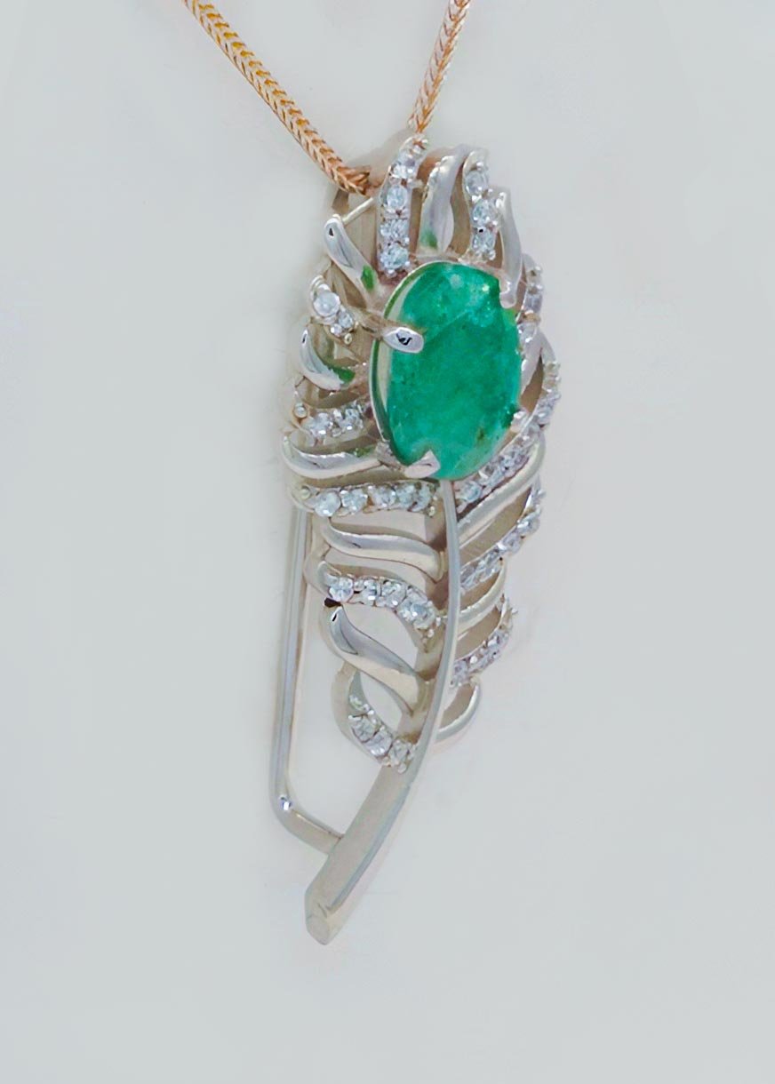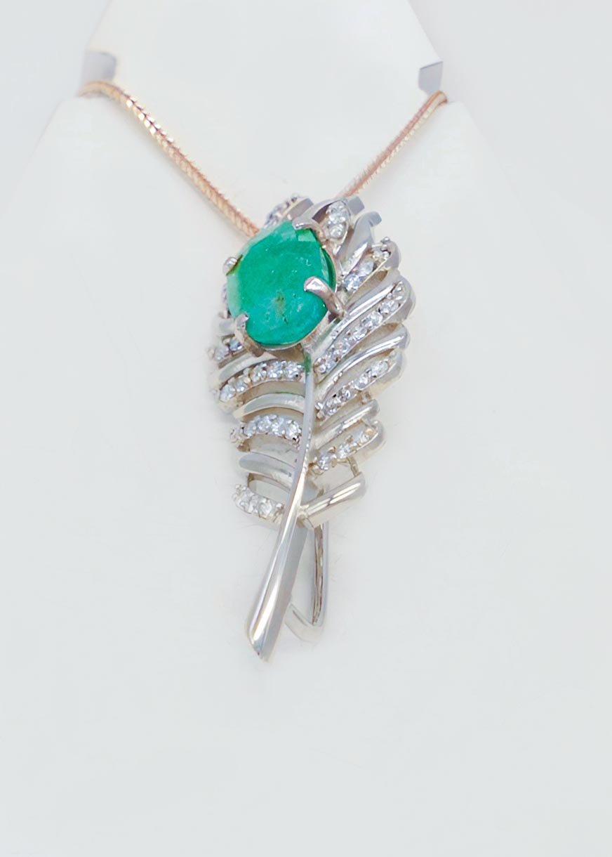 Enchanting Noora Emerald Bird Feather Silver Brooch Pendant