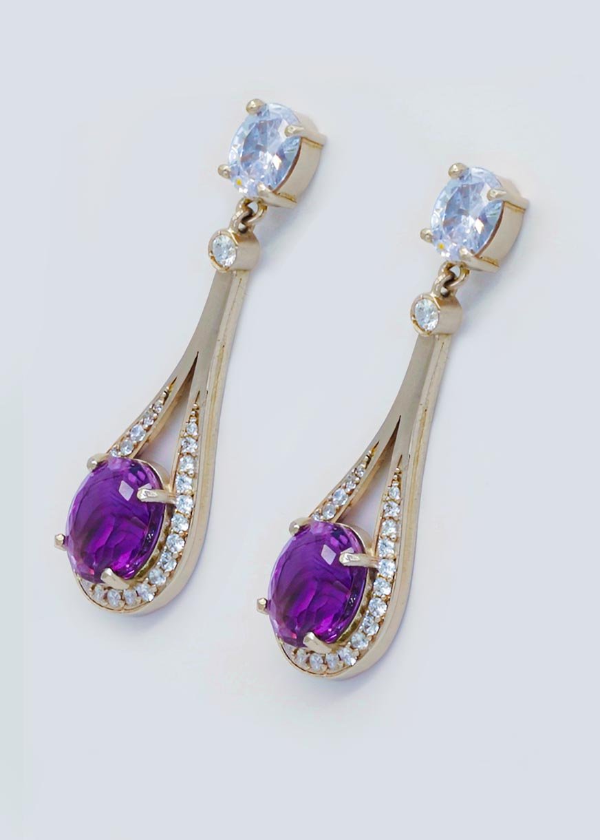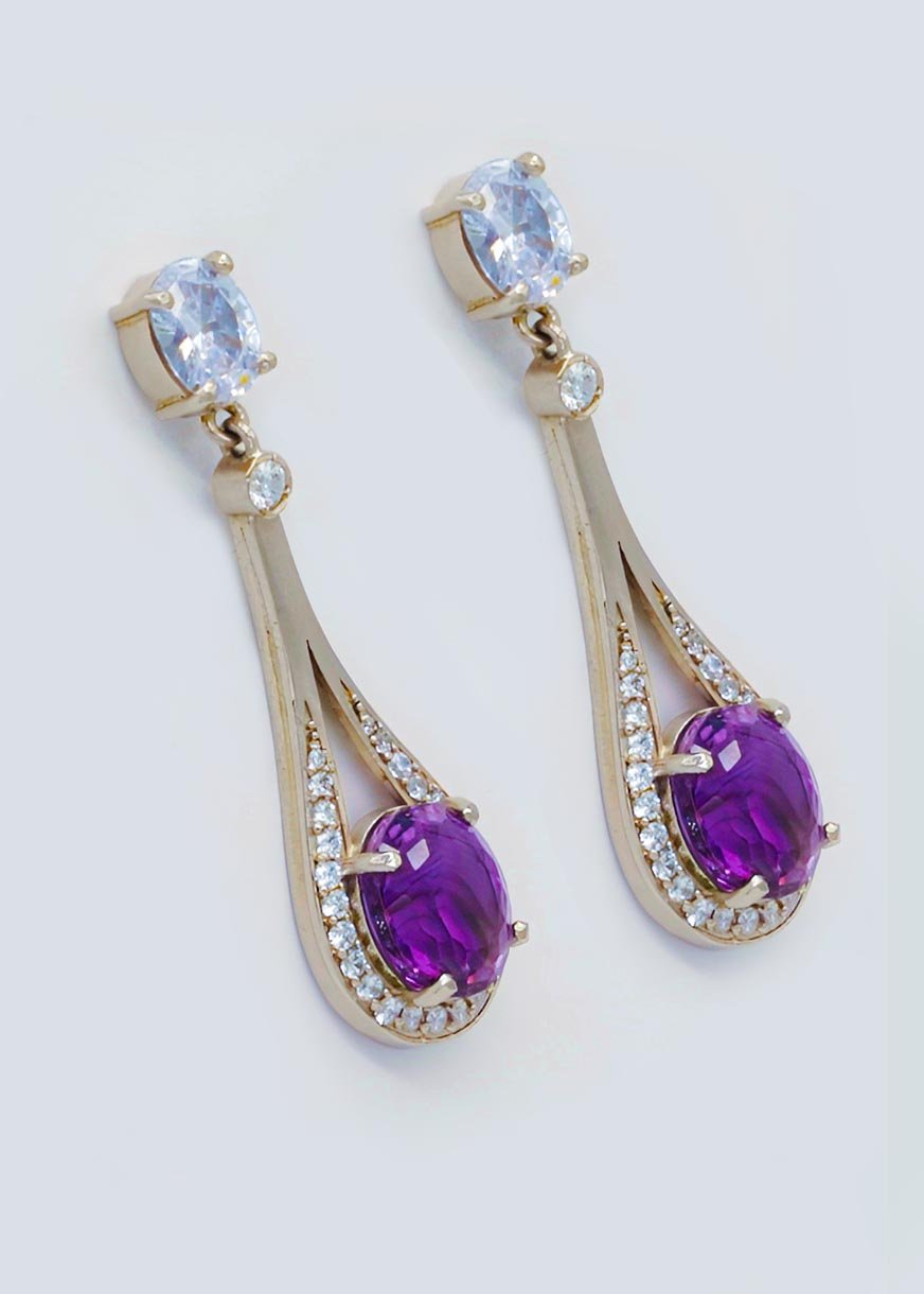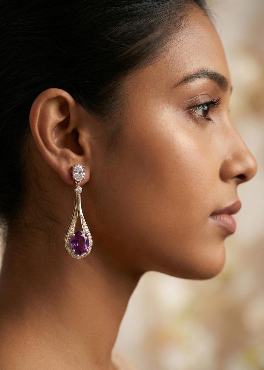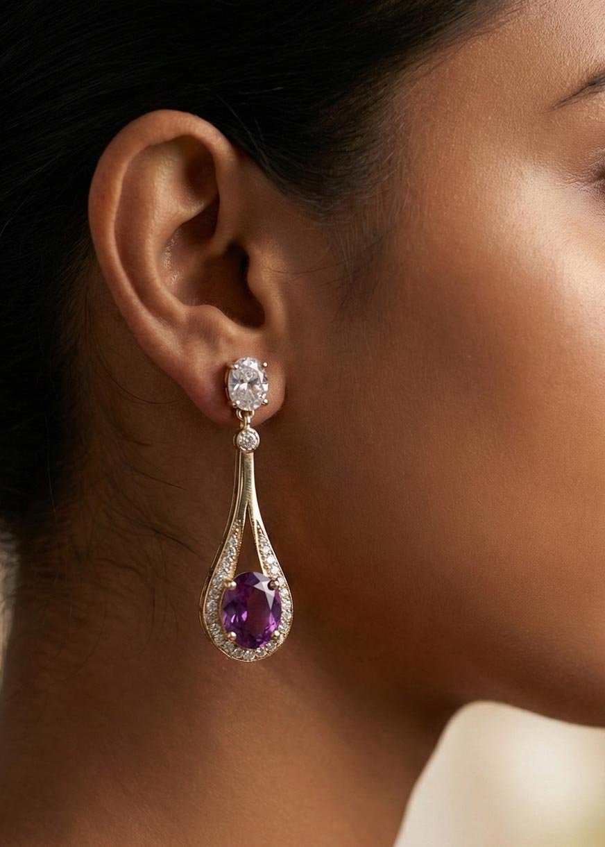 This stunning pair features 2 natural Amethyst stones and 2 natural Zirconia crystals, each sparkling beautifully to elevate any outfit. With its blend of elegance and charm, this ear dangler is perfect for festive wear, evening outings, or as a standout accessory for special occasions.