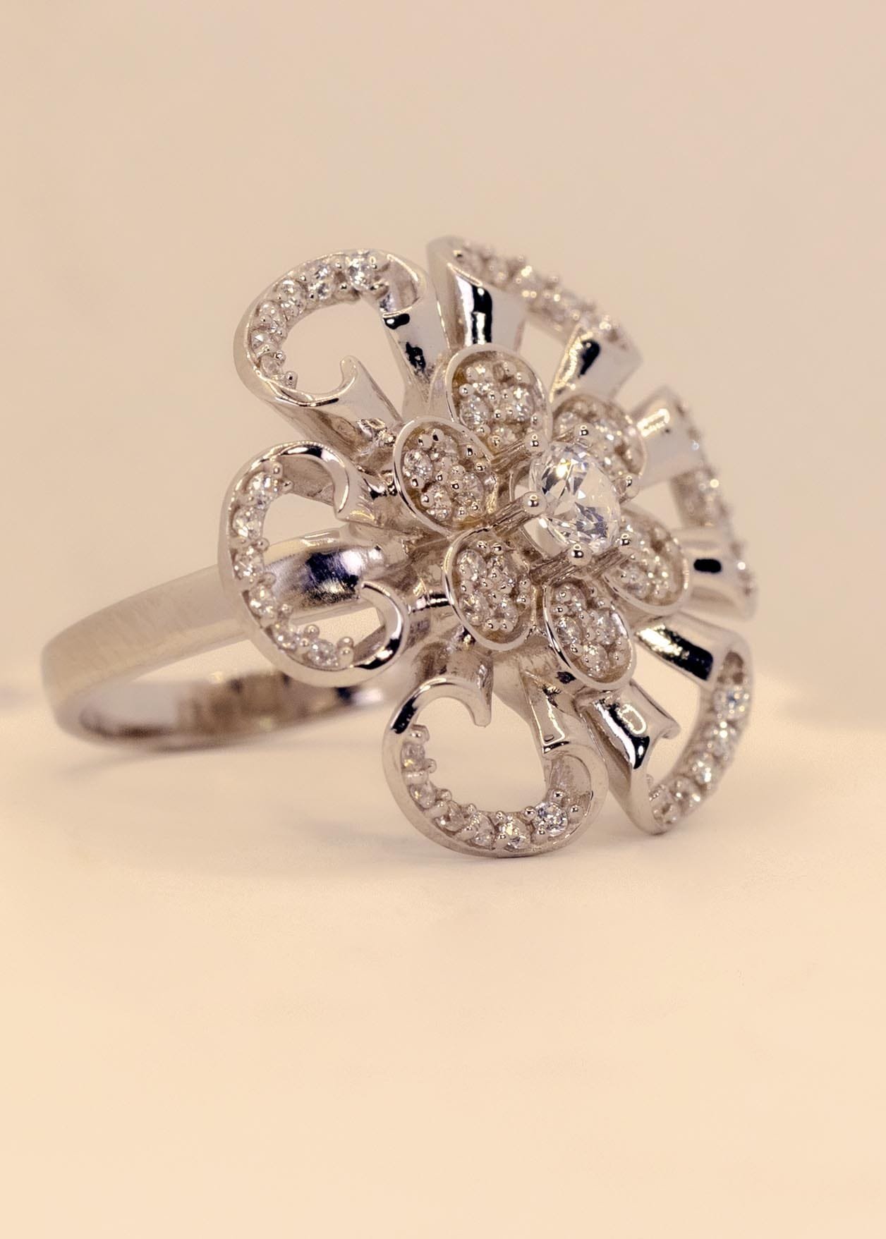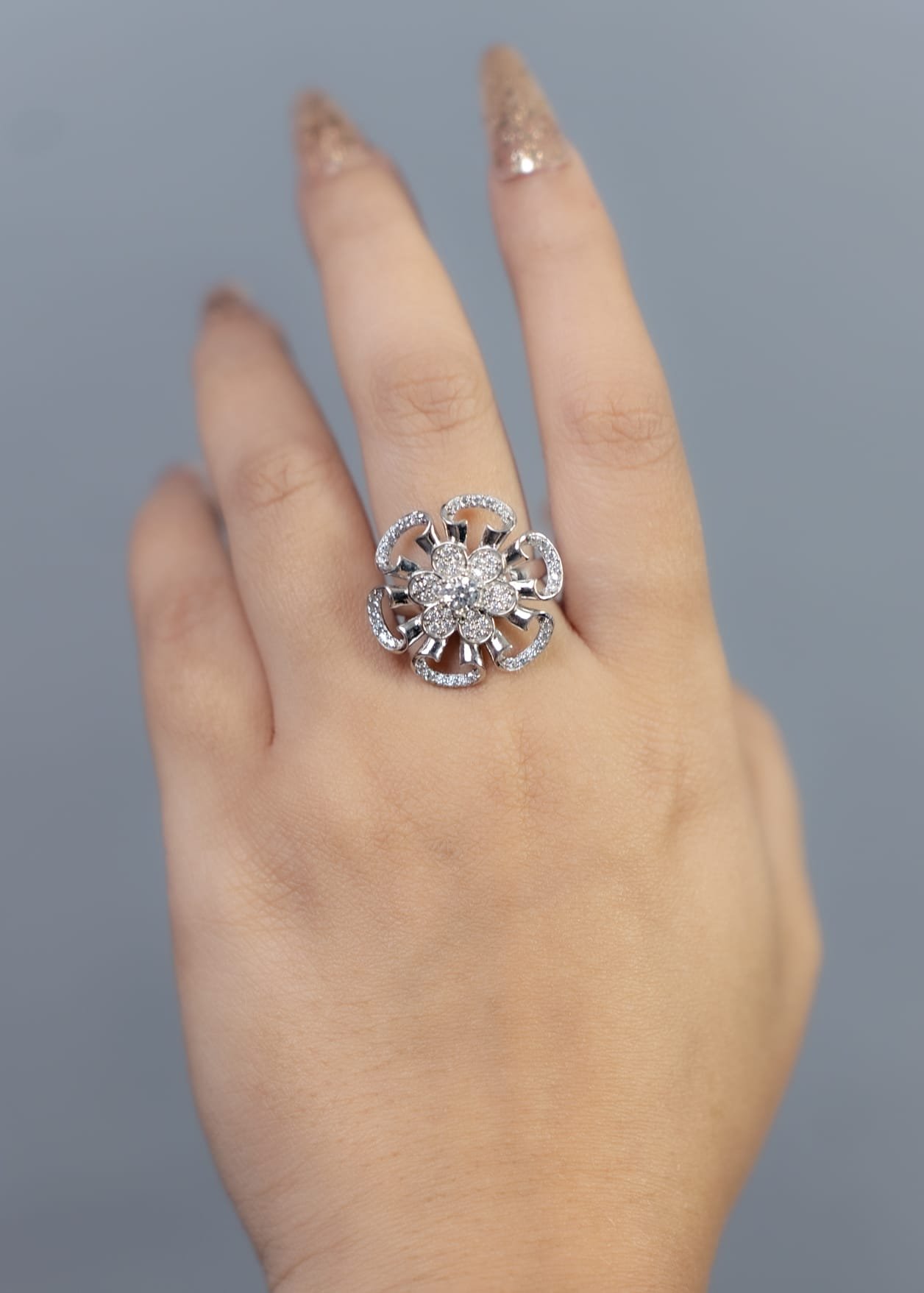 Crafted in silver and studded with zirconia, this cocktail ring has been designed to enhance your beauty. With a classic flower motif in the center and gorgeous blooming petals in the periphery, this silver ring is delicate, elegant, and feminine.