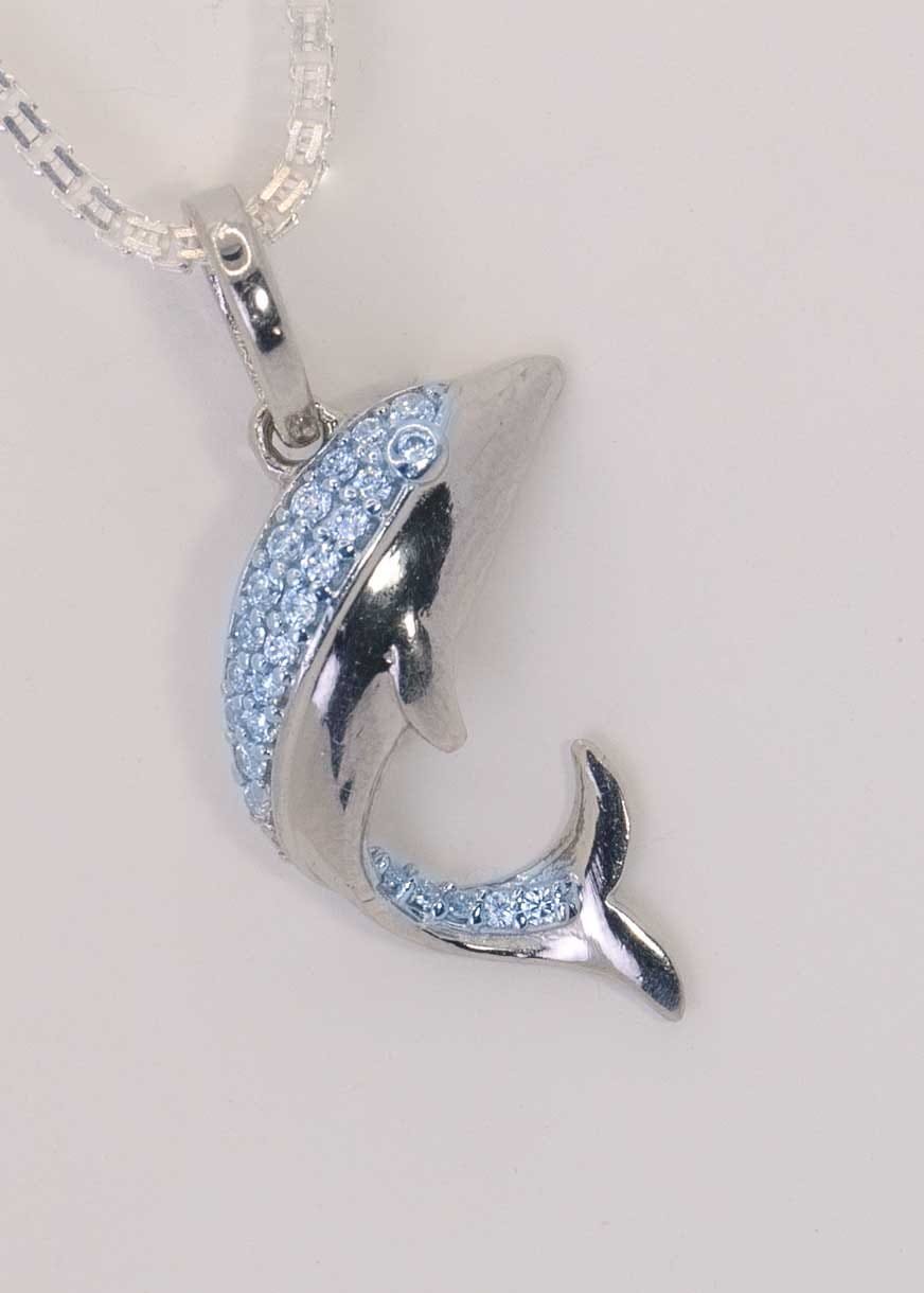 Embrace the spirit of the ocean with this elegant silver dolphin pendant. This Silver Marine Dolphin pendant, showcasing a gracefully leaping dolphin, is a beautiful symbol of joy and freedom. Perfect for ocean lovers, it adds a touch of whimsy and sophistication to any ensemble.