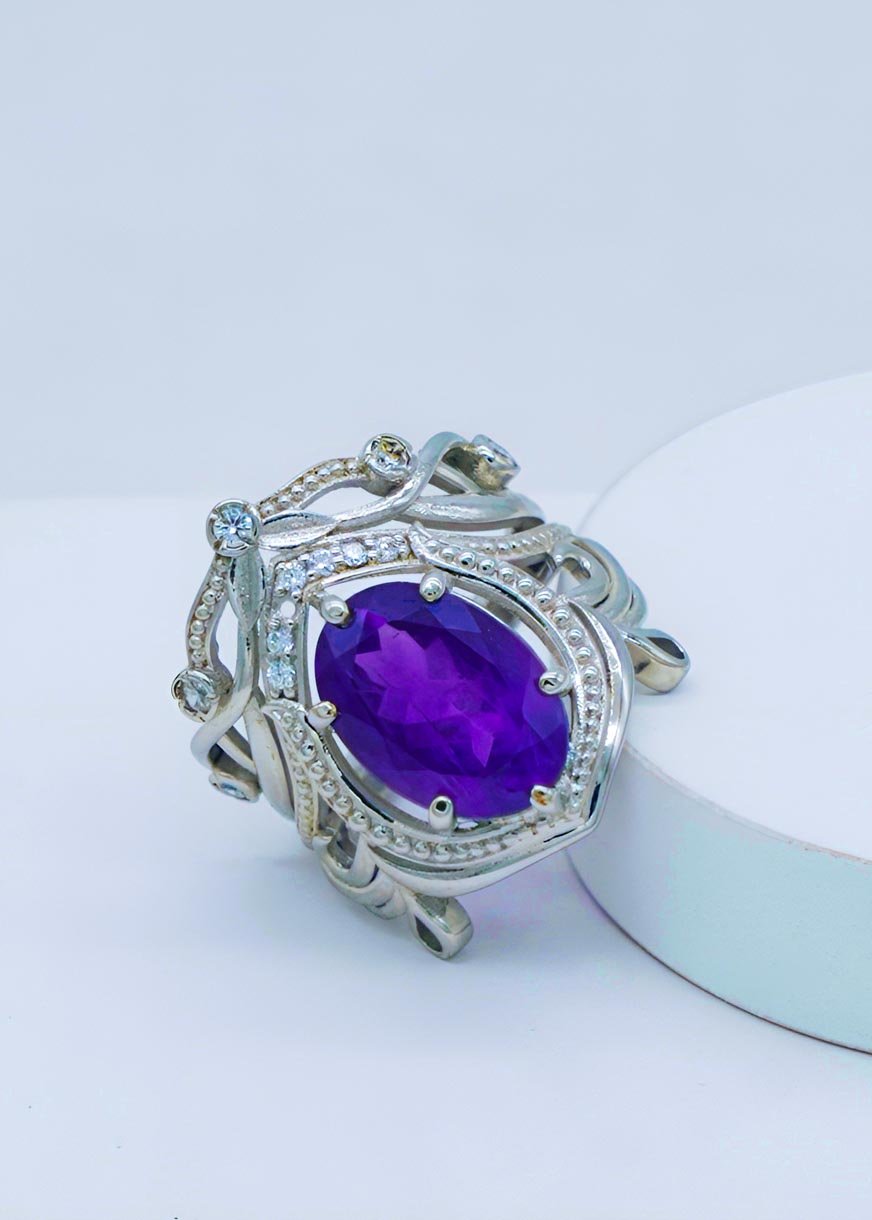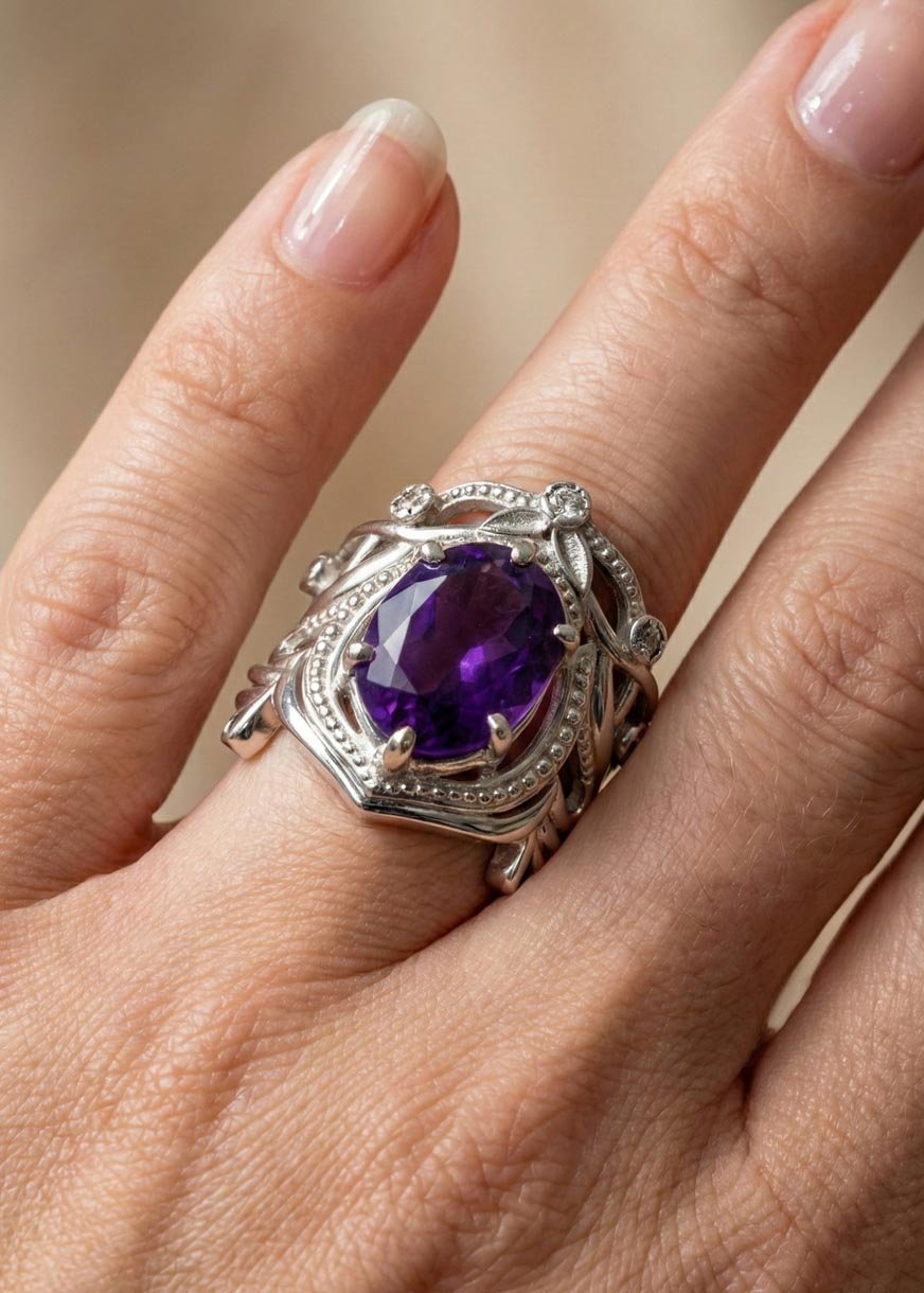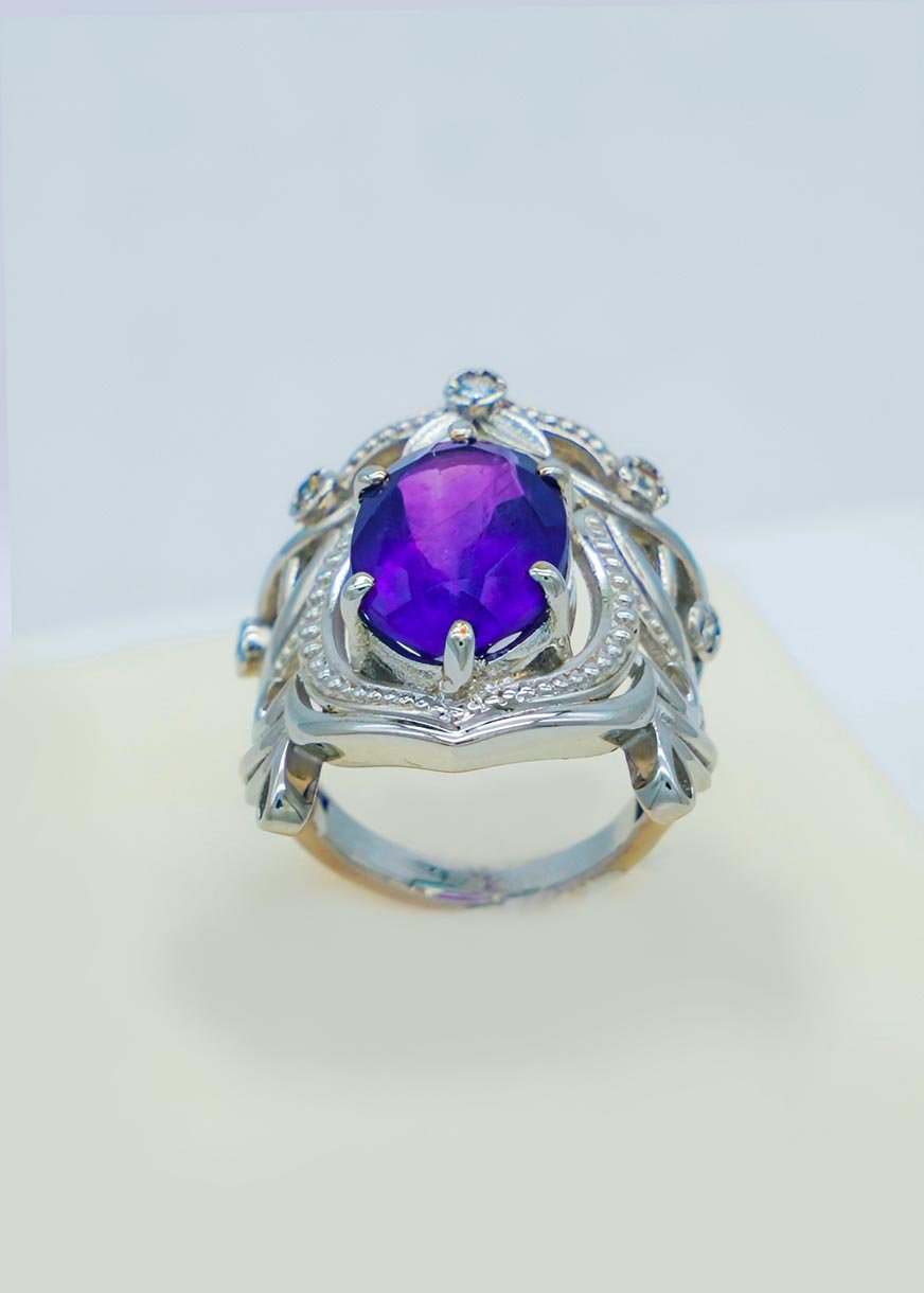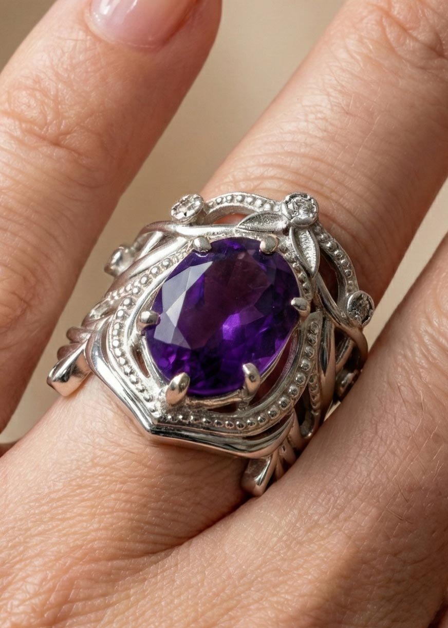 This captivating ring showcases a natural Amethyst, radiating a regal gleam that reflects true Victorian charm. Its intricate craftsmanship makes it a perfect blend of heritage beauty and modern refinement, ideal for elevating your everyday style or complementing special occasion looks.